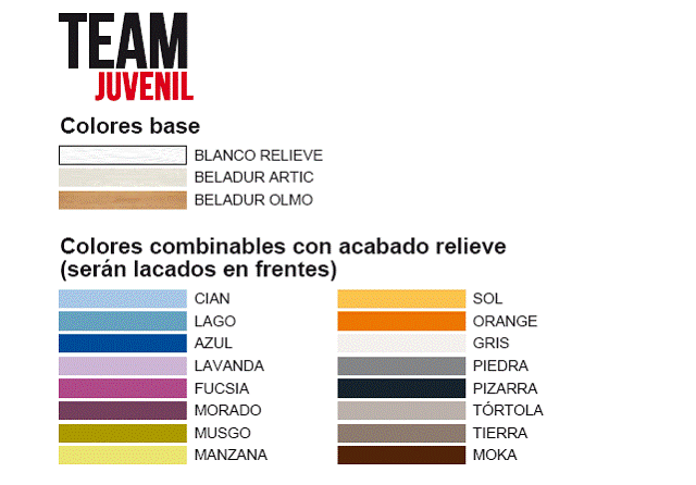 La colección Team permite a este fabricante competir por diseño con la mayría de fabricantes de juvenil españoles, ahora además con el colorido y la alegría que se imponen últimamente. Su punto fuerte será sin duda la calidad de los acabados y la resistencia de los muebles, es más que improbable que se presenten las tan temidas incidencias en el servicio. Indiscutiblemente es un fabricante a aprovechar por los que necesiten muebles con medidas especiales, en esos casos, además de ofrecer la misma seguridad, el presupuesto se hace muy competitivo.